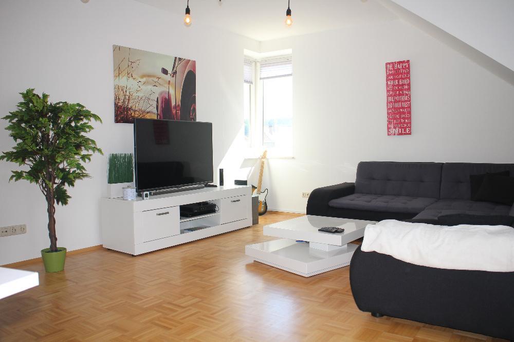 Im Dachgeschoss stehen Ihnen ein großes, über die gesamte Giebelseite verlaufendes Wohnzimmer, ein voll ausgestattetes Bad, zwei Schlafzimmer sowie ein kleiner Abstellraum zur Verfügung.