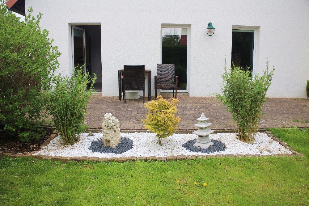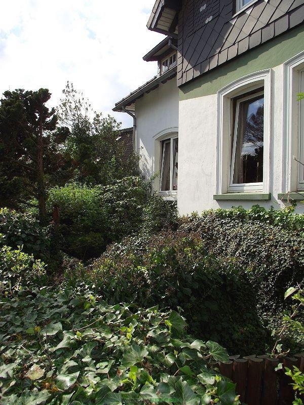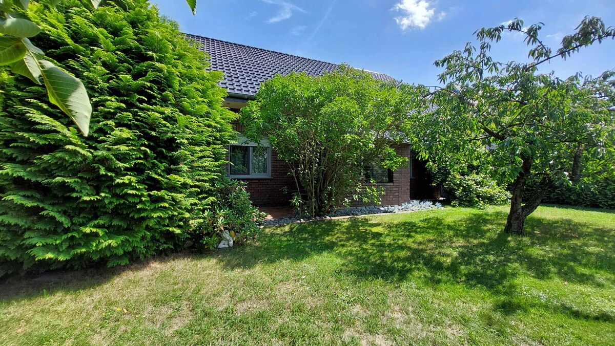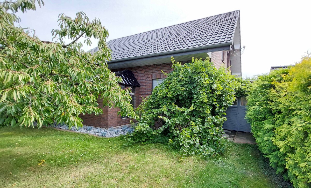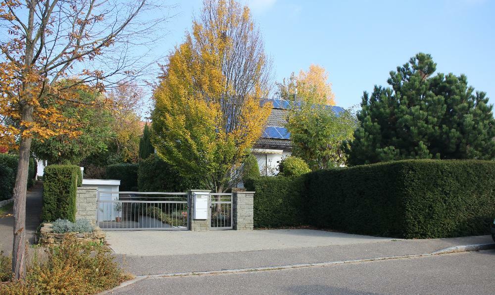 Der hinter einer hohen Hecke liegende, nicht einsehbare Vorgarten ist pflegeleicht angelegt. Auf dem Rasen und zwischen den Obstbäumen würde sich auch eine Schaukel oder ein Spielgerät gut machen.
