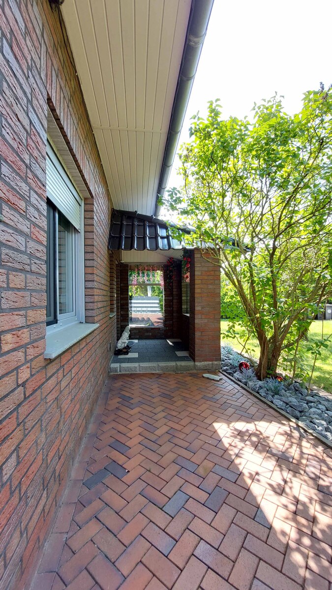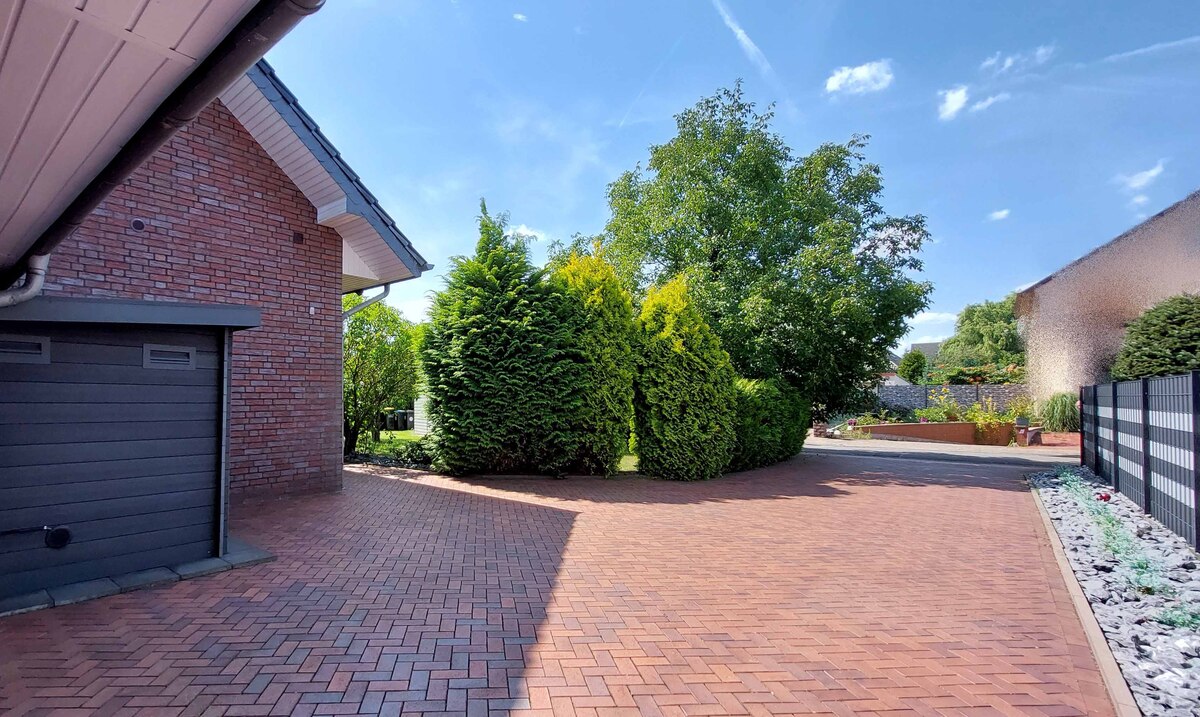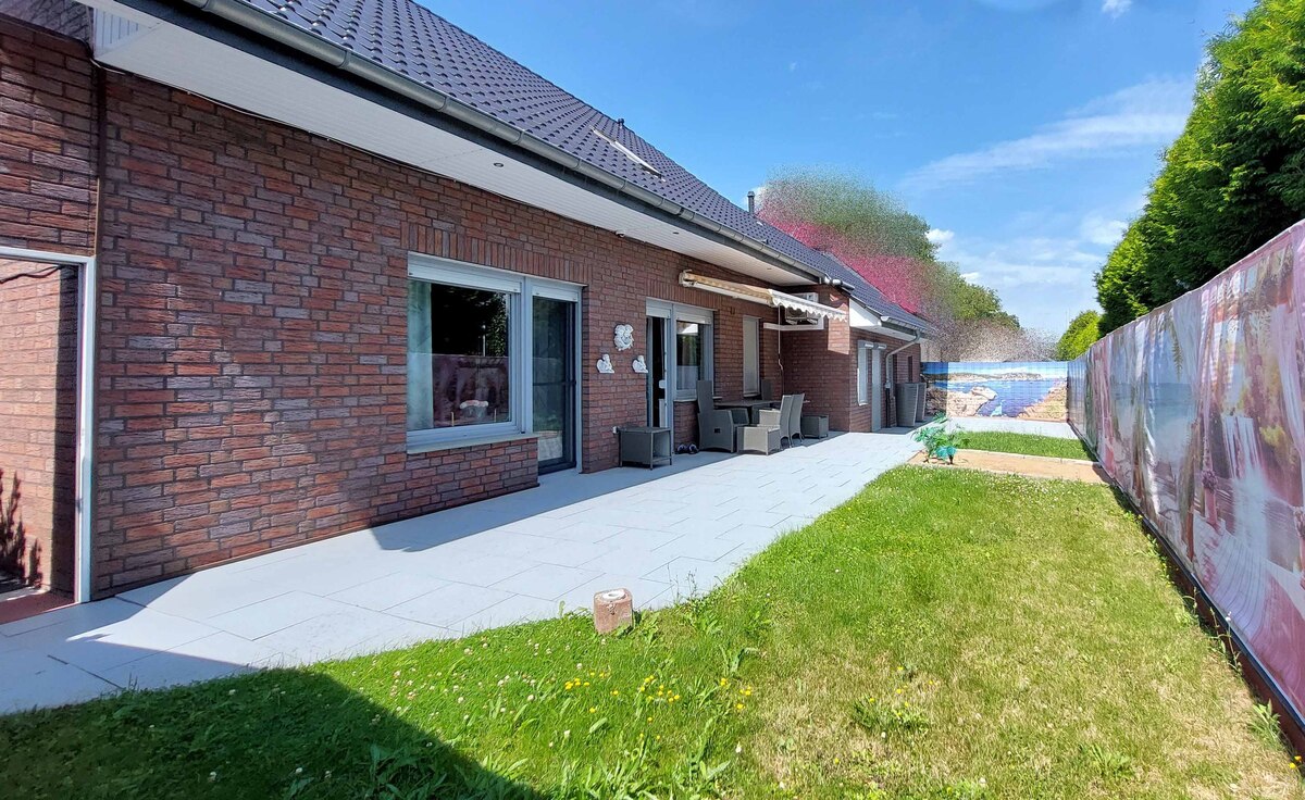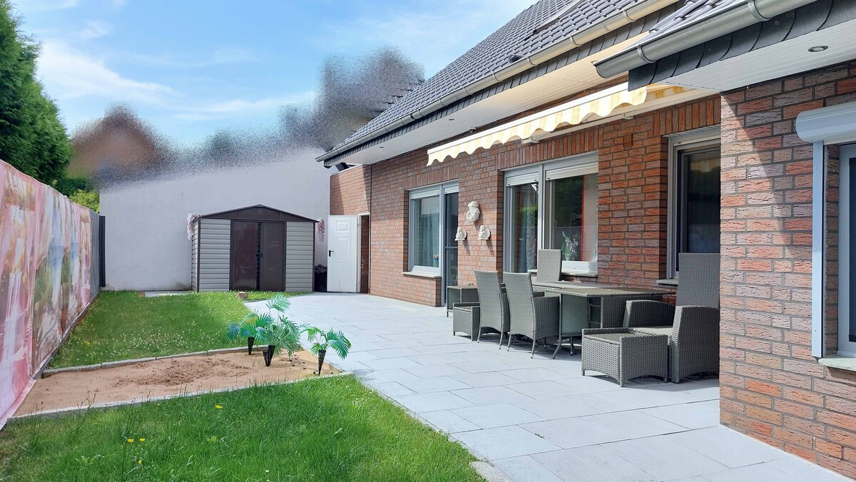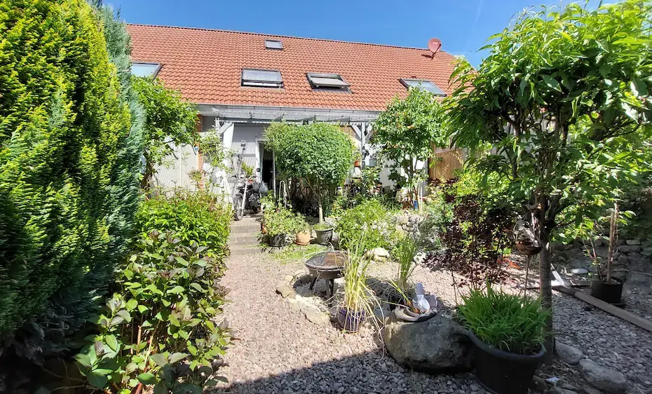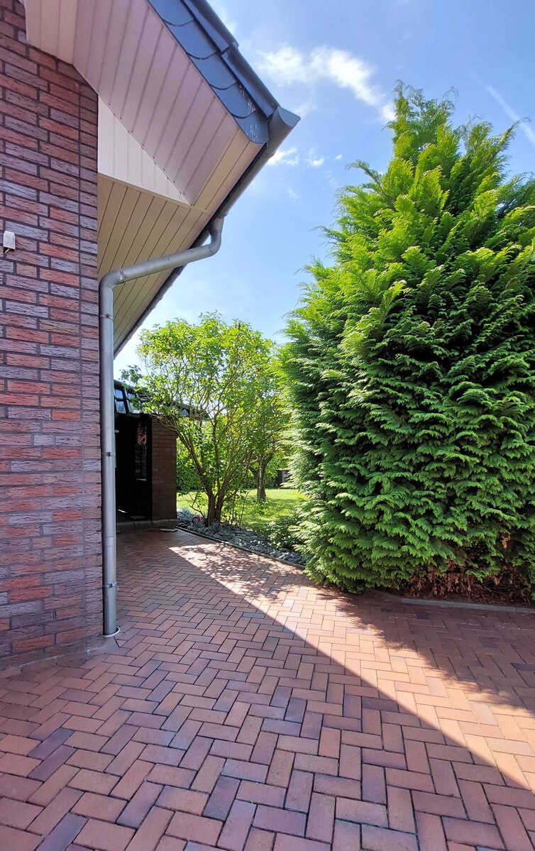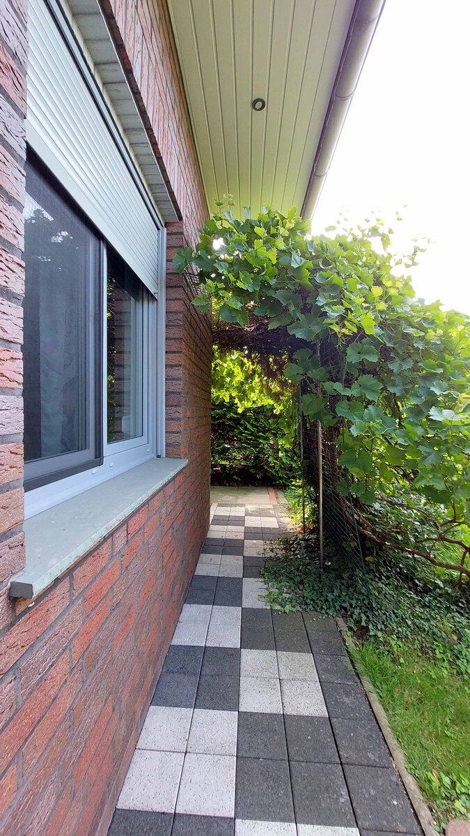 Die einladende Terrasse mit einem kleinen, hinteren Gartenanteil verläuft übrigens über die komplette Ostseite. Sie ist ein idealer Platz, um mit der Familie oder mit Freunden zusammenzusitzen – sei es zum Grillen oder einfach nur für eine Tasse Kaffee. Natürlich haben Sie hier noch ausreichend Platz für Ihre Hochbeete, einen Pool oder einen kleinen Sandkasten! Dieser Bereich ist vollständig eingezäunt.
