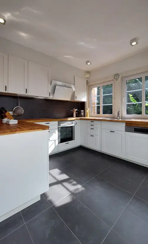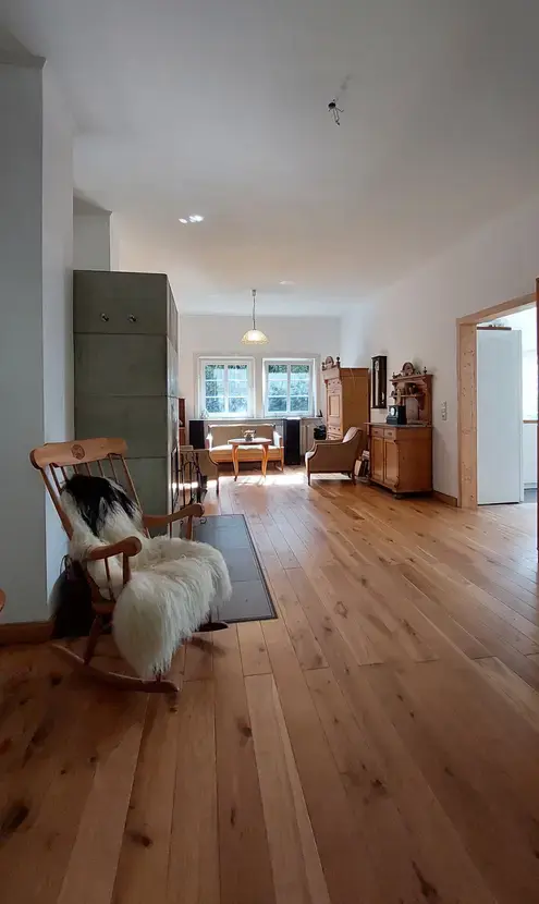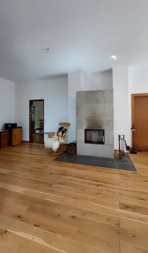 Die Fußböden im Erdgeschoss wurden größtenteils mit Perlite gedämmt bevor das Echtholzparkett und die Fliesen (Küche) verlegt worden sind.